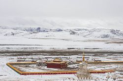 冬季的色達(dá),常常被皚皚白雪覆蓋,民居、帳篷、寺院、經(jīng)幡、牦牛點(diǎn)綴期間,美麗迷人。