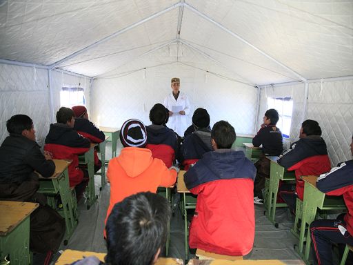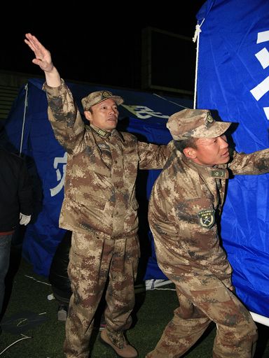 軍分區(qū)政委王衛(wèi)紅搭建帳篷。