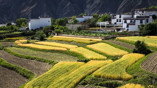 清晨,瓦藍(lán)瓦藍(lán)的天空云霧繚繞,周圍的景物一片朦朧,就好像童話里的仙境,一會兒,太陽從東邊冉冉升起,霧也漸漸消失,村子里屋頂上飄著裊裊煨桑的煙子,我站在山岡上從高處向下俯望,只見高山峽谷之中,層層翠綠的梯田簇?fù)碇l(xiāng)城特有的白藏房,山下的田野,就像一片金色的海洋,將秀麗的田園裝扮得更加如詩如畫。一陣晨風(fēng)吹過,麥田上蕩起了一道道金色的波紋,遠(yuǎn)處傳來了畫眉鳥的歌聲,我被眼前的一切迷住了,仿佛一切都靜止了,她讓我的夢從這里開始。