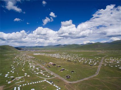 7月31日,石渠縣扎溪卡大草原上,藍(lán)天、白云與草地、帳篷相互映襯。