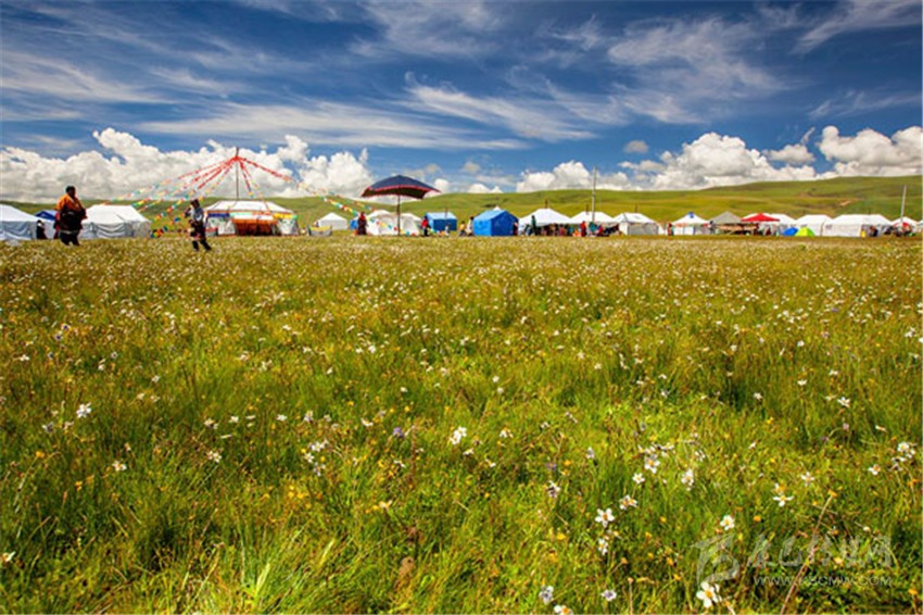 拉日馬大草原,藏語(yǔ)譯為神仙居住的地方,寬闊的草原、豐茂的水草、茫茫的-、蜿蜒清澈的拉曲河,構(gòu)成的一幅天然畫卷。加之當(dāng)?shù)啬撩窦儤愕拿耧L(fēng)、散落在草原上星星點(diǎn)點(diǎn)的牛群、帳篷,給人一種回歸之感。倘若是在夏季,草原上成為花的海洋,四處飄溢著花的芬芳和奶香,在醉人的季節(jié)里,定會(huì)使人留連忘返。