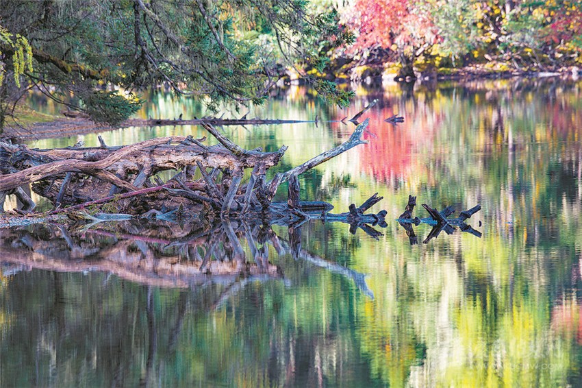 “江”與“湖”,靜臥于原始森林與草甸花海的之間,河溪清澈,湖水湛藍(lán),真如秘密花園,人間仙境。湖畔最美的是盤根錯(cuò)節(jié)的老柏樹(shù),枝條彎曲如蒼龍,或立于湖畔,或臥于湖中,滿湖樹(shù)影、花影隨風(fēng)搖曳。