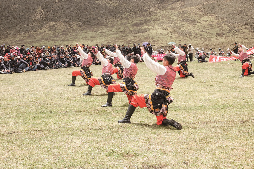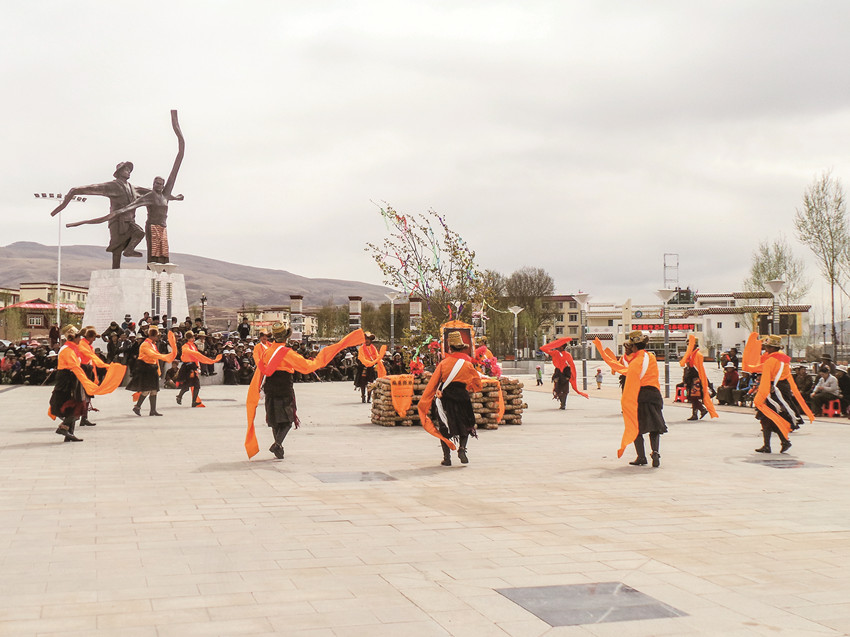 座落在雅礱江畔的甘孜縣,春天是十分美麗的,當(dāng)江水解除冰凍,大山披綠的時候,會聽到滿山的布谷鳥鳴唱,草原上鮮花盛開。踢踏舞動的銅鈴聲極像草原吟唱的歌喉,讓人聞之心醉,醉在那走向春天的踢踏。