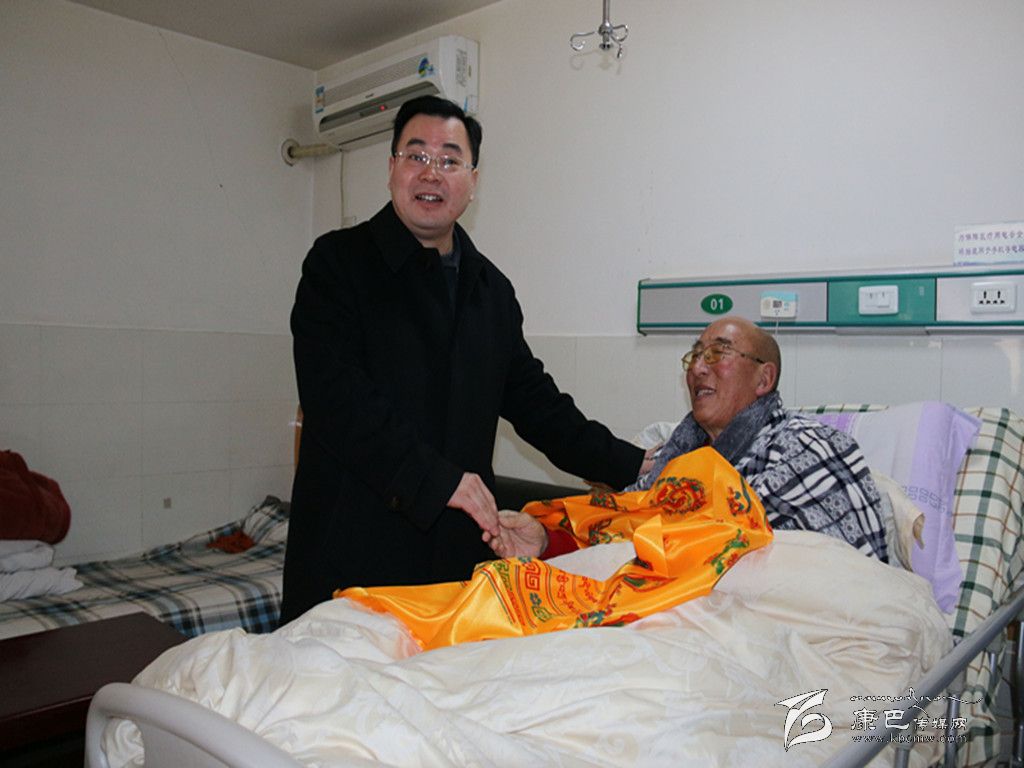上午10時許,胡昌升來到醫(yī)院病房,與香根活佛的家屬和醫(yī)務人員一一握手,并走到香根活佛病床前,送上哈達和慰問金,俯身親切地握著他的手,關切地詢問其身體狀況。“病情有沒有好轉?”“身體現(xiàn)在還有哪些地方感覺不舒服?”“每天要輸幾次液?做幾次理療?”“有沒有人在醫(yī)院照顧你?”“住院期間有什么困難沒有?”一句句貼心的話語,充滿了關懷之情,猶如一股股暖流涌動在香根活佛和在場每個人的心間。大家雖身處寒冬,卻感覺暖意融融。