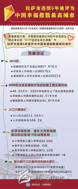 新華社北京4月15日電(記者張曉松、郭麗琨)白皮書說,西藏絕大多數(shù)人口擺脫了延續(xù)上千年的貧困,基本達(dá)到了小康生活水平。在國家統(tǒng)計(jì)局、中國郵政集團(tuán)公司和中央電視臺(tái)聯(lián)合舉辦的“CCTV經(jīng)濟(jì)生活大調(diào)查”中,拉薩市連續(xù)5年被評(píng)為中國幸福指數(shù)最高的城市。