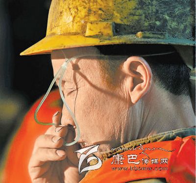 工人丁獻(xiàn)清在施工間隙吸氧。