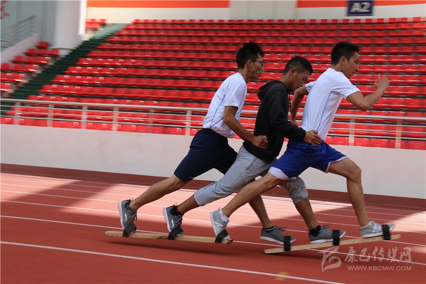 “啪,啪,啪……”,在高腳競(jìng)速訓(xùn)練場(chǎng)地的對(duì)面,板拍打地面的聲音有節(jié)奏地在賽道上回蕩著。記者看到4組板鞋競(jìng)速隊(duì)正在有序訓(xùn)練,每隊(duì)有三名運(yùn)動(dòng)員,他們都把腳套在一個(gè)木板鞋上,后面的兩個(gè)運(yùn)動(dòng)員把手放在前一個(gè)運(yùn)動(dòng)員的腰上,三個(gè)人齊心協(xié)力,喊著有節(jié)奏的口號(hào),彼此邁著統(tǒng)一的步伐為了共同的目標(biāo)而前進(jìn)。每一組的隊(duì)員都是齊心協(xié)力,好像他們已然融為一體,步伐的頻率和擺臂的頻率都是一致的,絲毫沒(méi)有違和感。