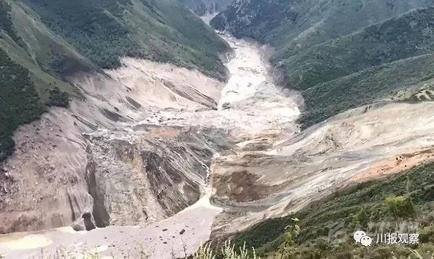 另據(jù)四川省防指和四川省水利廳工作組反饋:堰塞湖所在江段長約10.6公里,河谷為“V”形峽谷,兩側岸坡坡度20~60°,河谷結構為斜向谷。河道上游彎曲、下游稍順直,水流急,局部稍緩。初步統(tǒng)計,該段江段共有滑坡10處,崩塌3處,泥石流溝8條。其中有2處大型滑坡,即則學滑坡和仁達滑坡。