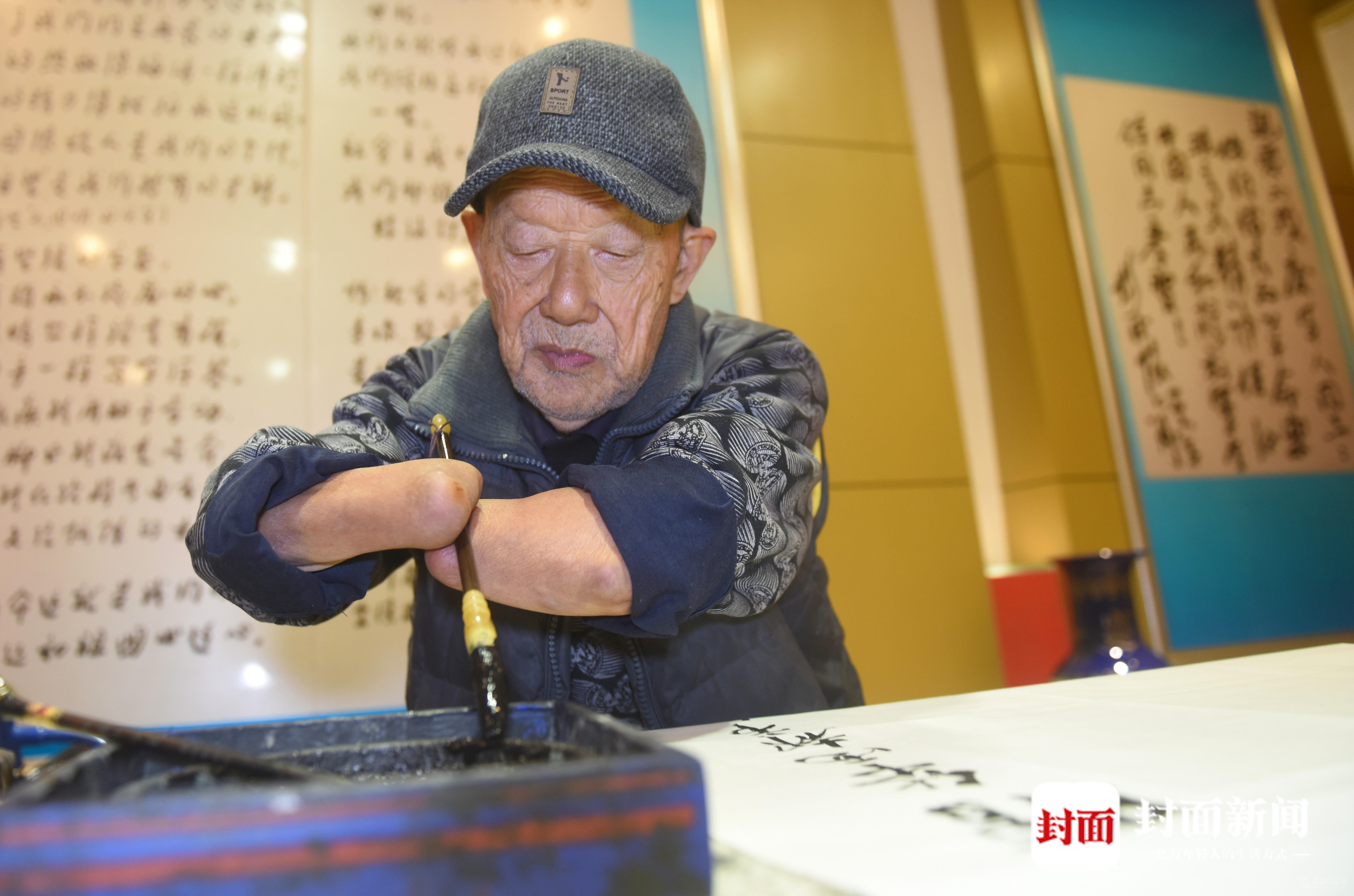 最初,他把鋼筆綁在手臂上,練習(xí)了一兩年才做到橫平豎直;之后,他用兩只斷臂抱著毛筆寫(xiě)書(shū)法。