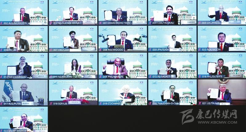 這是與會(huì)各經(jīng)濟(jì)體領(lǐng)導(dǎo)人、代表通過(guò)《2040年亞太經(jīng)合組織布特拉加亞愿景》并線(xiàn)上合影。新華社記者 李響 攝