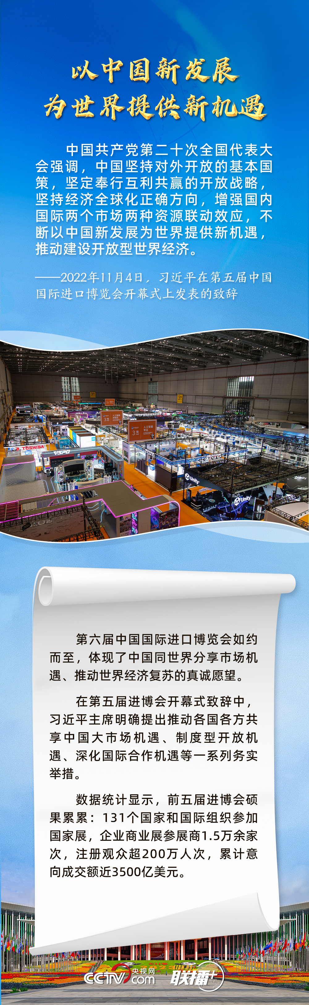 聯(lián)播+11月5日,第六屆中國(guó)國(guó)際進(jìn)口博覽會(huì)在上海開幕。習(xí)近平主席在致信中指出,2018年以來(lái),進(jìn)博會(huì)成功舉辦五屆,依托中國(guó)大市場(chǎng)優(yōu)勢(shì),發(fā)揮國(guó)際采購(gòu)、投資促進(jìn)、人文交流、開放合作平臺(tái)功能,對(duì)加快構(gòu)建新發(fā)展格局和推動(dòng)世界經(jīng)濟(jì)發(fā)展作出了積極貢獻(xiàn)。