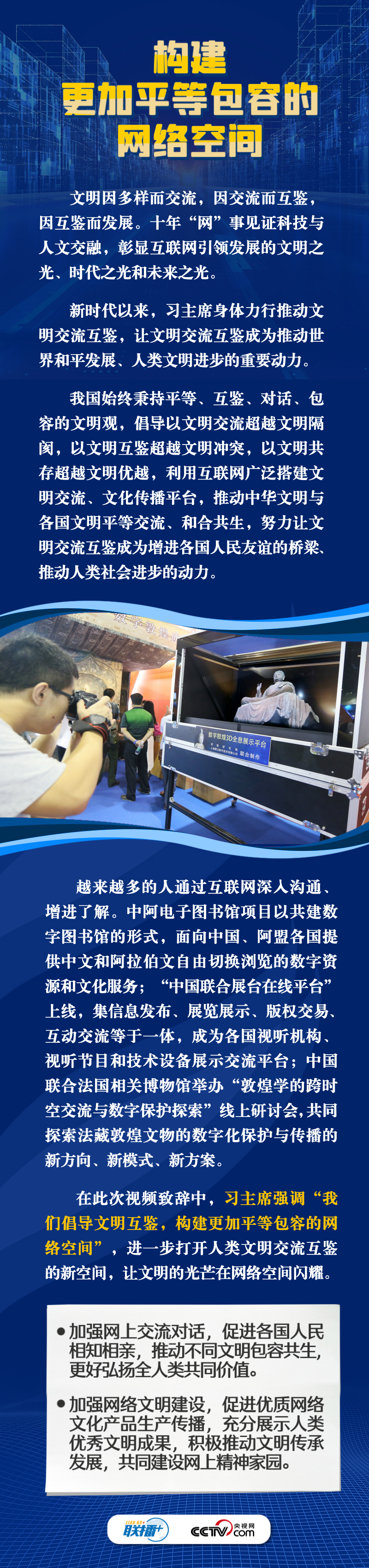 面對(duì)新的時(shí)代課題,習(xí)主席在此次視頻致辭中倡導(dǎo)構(gòu)建更加普惠繁榮、更加和平安全、更加平等包容的網(wǎng)絡(luò)空間。這三個(gè)網(wǎng)絡(luò)空間”具體內(nèi)容是什么?構(gòu)建網(wǎng)絡(luò)“新空間”有什么具體措施?央視網(wǎng)《聯(lián)播+》與您一同學(xué)習(xí)。