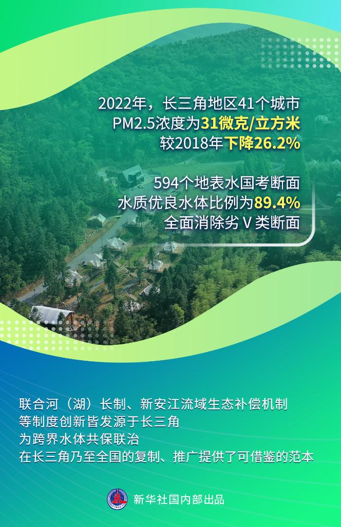 2022年,長(zhǎng)三角地區(qū)41個(gè)城市PM2.5濃度為31微克/立方米,較2018年下降26.2%。594個(gè)地表水國(guó)考斷面水質(zhì)優(yōu)良水體比例為89.4%,全面消除劣Ⅴ類斷面。