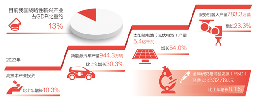 發(fā)展壯大戰(zhàn)略性新興產(chǎn)業(yè)。“戰(zhàn)略性新興產(chǎn)業(yè)具有創(chuàng)新活躍、技術(shù)密集等特點(diǎn),為新質(zhì)生產(chǎn)力發(fā)展壯大提供了巨大空間?!备呶拇碚f,近年來,我國戰(zhàn)略性新興產(chǎn)業(yè)蓬勃發(fā)展,目前戰(zhàn)略性新興產(chǎn)業(yè)占GDP比重約13%。