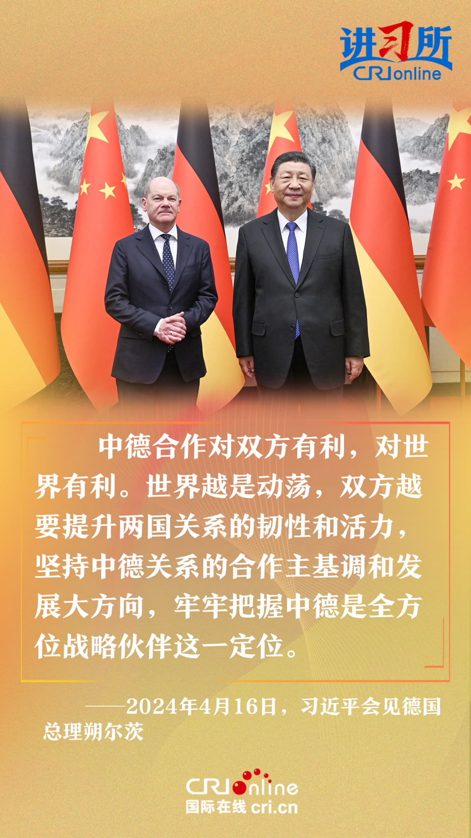 4月16日上午,中國國家主席習近平在北京釣魚臺國賓館會見了德國總理朔爾茨。習近平指出,中德合作對雙方有利,對世界有利。世界越是動蕩,雙方越要提升兩國關系的韌性和活力。中德是世界第二、第三大經(jīng)濟體,鞏固和發(fā)展中德關系的意義超越雙邊關系范疇,對亞歐大陸乃至整個世界都有重要影響。兩國要從長遠和戰(zhàn)略角度看待和發(fā)展雙邊關系,攜手為世界注入更多穩(wěn)定性和確定性。