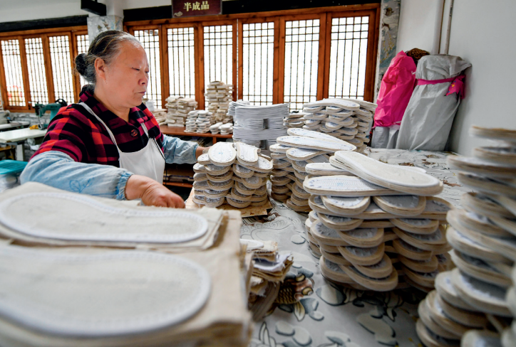 △ 2020年4月17日,成都市郫都區(qū)唐昌街道戰(zhàn)旗村,賴(lài)淑芳整理擺放制作完成的布鞋鞋底。