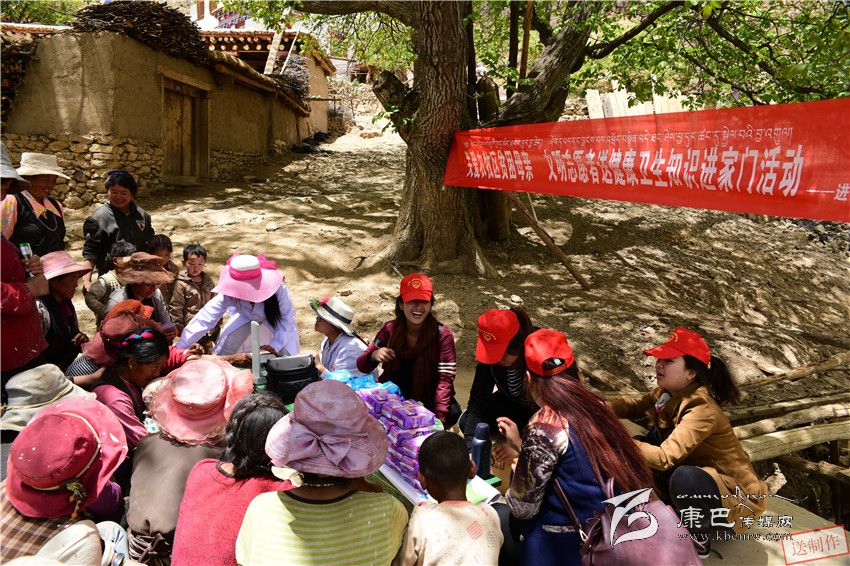 中心絨鄉(xiāng)安里頂村的四郎志瑪剛剛給地里的農(nóng)作物澆水回來,就發(fā)現(xiàn)村里來了一群戴著小紅帽的“不速之客”,他們周圍聚集著提前趕來的鄉(xiāng)親。兩位穿著白大褂的“小紅帽”正在為排著長隊的鄉(xiāng)親們免費體檢,另外還有兩位戴“小紅帽”的女性志愿者召集婦女村民為她們講解健康衛(wèi)生知識,演示女性衛(wèi)生用品的使用方法。