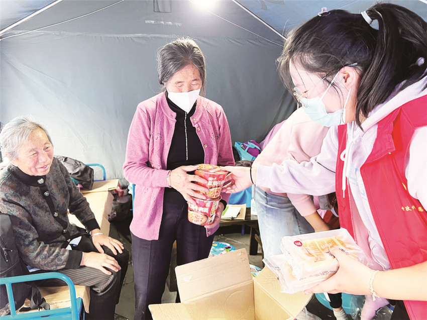 身穿紅色背心的志愿者向受災(zāi)群眾發(fā)放食品。
