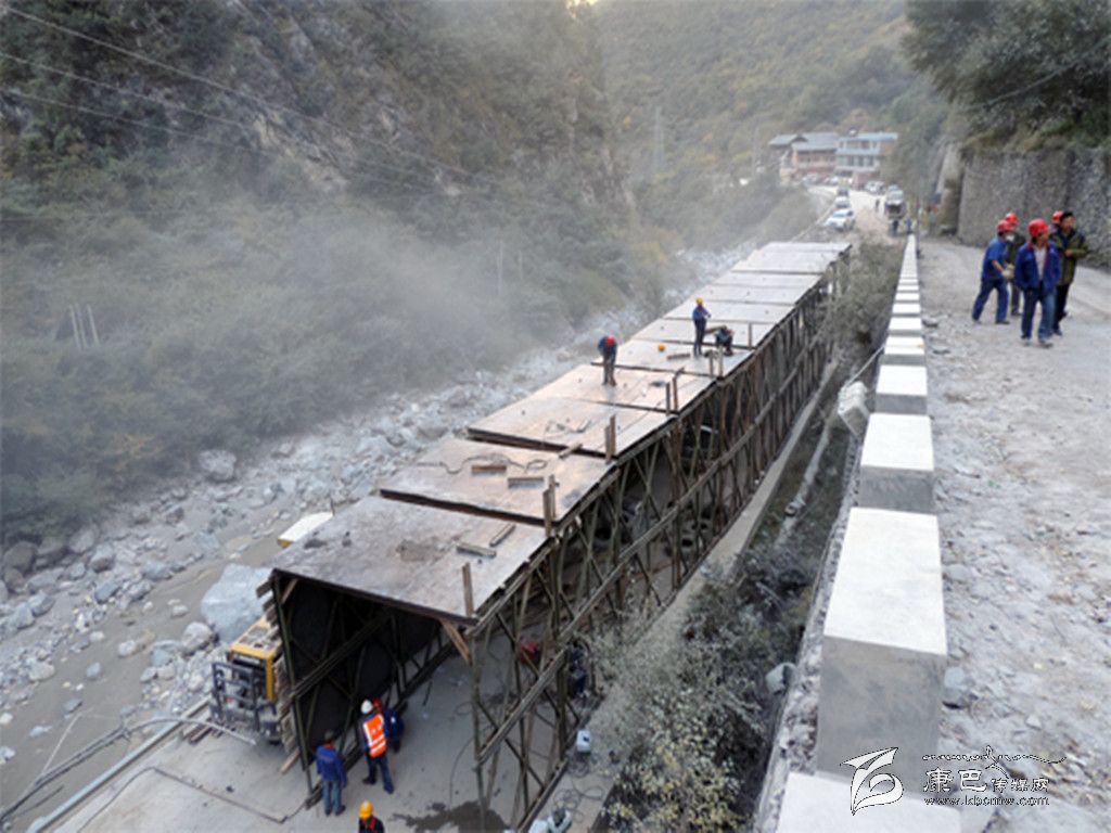 針對(duì)山體崩塌及道路受阻情況,甘孜水電公司與有關(guān)參建單位就隧道搶通、防護(hù)網(wǎng)安裝等多個(gè)防護(hù)搶通方案進(jìn)行了比選和論證,確定了架設(shè)鋼結(jié)構(gòu)棚洞應(yīng)急保通方案,并用8天時(shí)間高效快捷地完成了78米長的一期防護(hù)棚洞建設(shè),使湯壩土料場公路具備臨時(shí)通行條件,緩解了山體崩塌給當(dāng)?shù)厝罕娚a(chǎn)生活造成的影響,切實(shí)履行了央企的社會(huì)責(zé)任,有效降低了山體崩塌對(duì)長河壩工程建設(shè)的進(jìn)度影響。