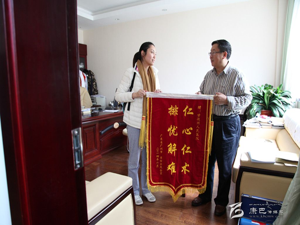多吉院長(zhǎng)代表醫(yī)院接受來(lái)自廣州的肖女士贈(zèng)送的錦旗。