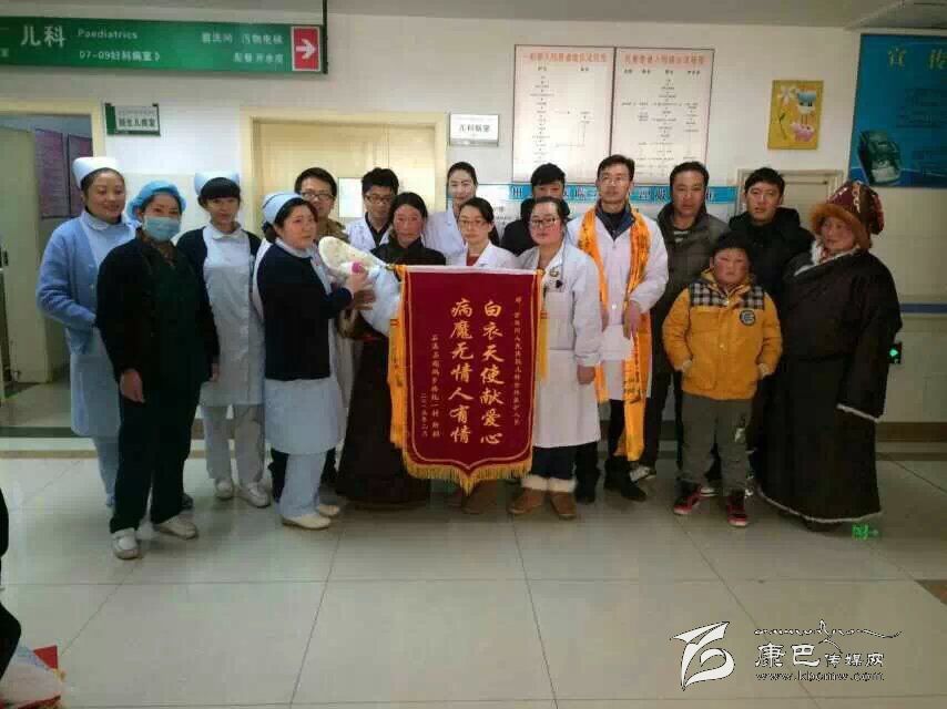 懷抱那胖乎乎、體重已經(jīng)增至2.9公斤的健康小寶寶,小家伙的母親雙眼流出了感激的淚花,她伸出大拇指,不停地“卡措、卡措(謝謝)”點頭致謝。為了表達(dá)感激之情,家人還特地送來了一面錦旗,上面印著“病魔無情人有情,白衣天使獻(xiàn)愛心”。