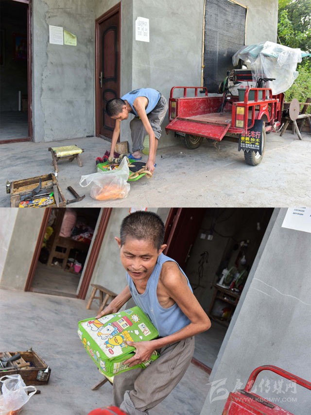 “周強(qiáng)善曾是全鄉(xiāng)最困難的貧困戶?!敝行泥l(xiāng)黨委書記楊壘說,周強(qiáng)善的妻子在剛生下女兒后因病去世。2005年,他在外務(wù)工時右腿受傷,留下殘疾。后來他自學(xué)補(bǔ)鞋技術(shù),成了一名鞋匠,但腿腳不便、下山路不通,三娃多年“悶”在家里。