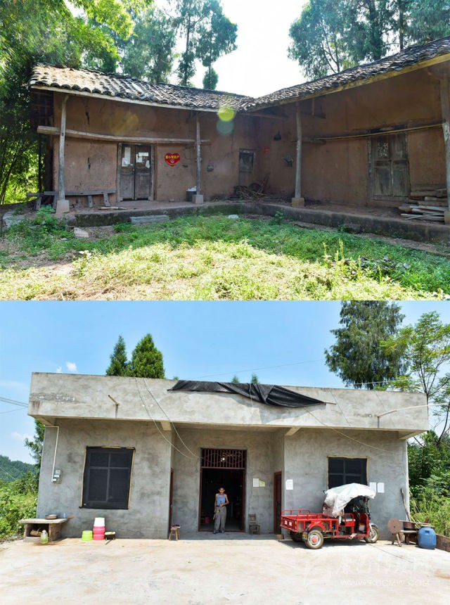新舊家對比圖。上圖為周強(qiáng)善家以前的舊屋,下圖為現(xiàn)在鋼混結(jié)構(gòu)的新家。攝影 張可凡