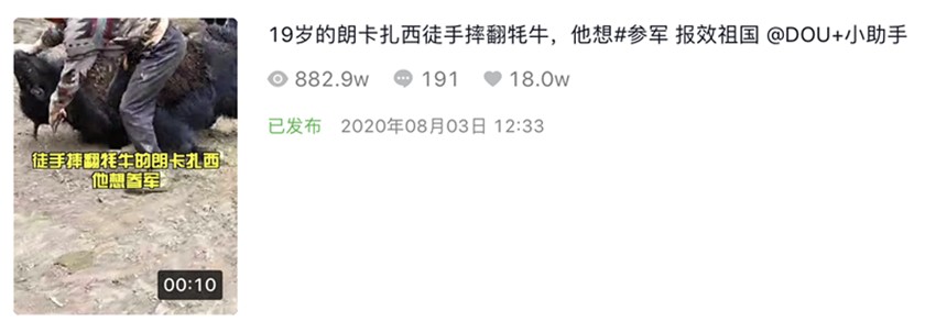8月3日,這段僅有10秒長的視頻,在抖音短視頻平臺《甘孜日報》康巴傳媒抖音號發(fā)布后,短短一天內(nèi)獲得了800多萬次播放量,200多名網(wǎng)友留言評論,18萬次點贊更是“宣告”其正式成為“網(wǎng)絡(luò)爆款”。
